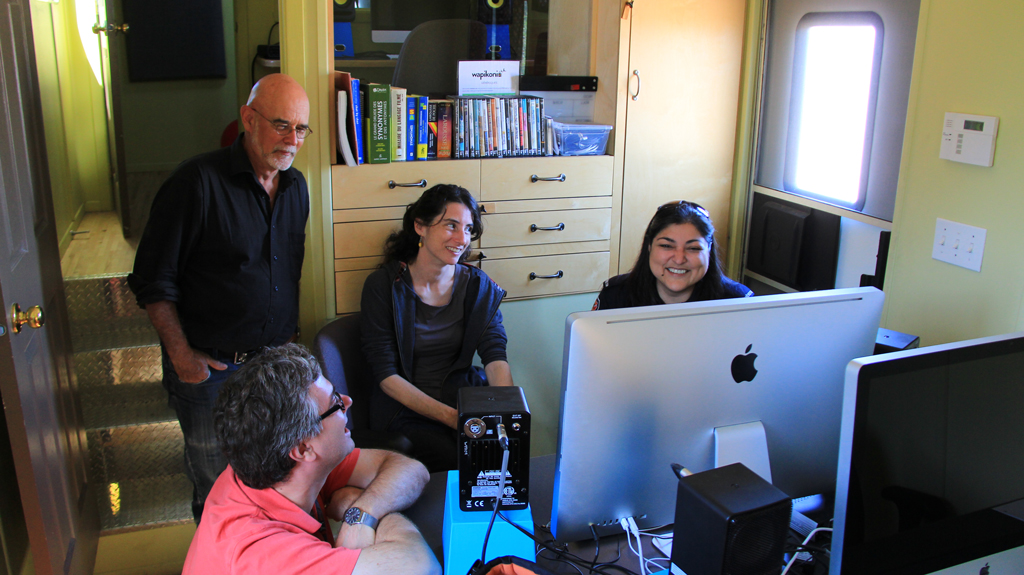 Nous faisons le plein de denrées et d’amour chez nos amis chibougamois. Départ vers 9h. Il fait chaud, anormalement chaud pour la saison, sur la route entre Chibougamau et la rivière Témiscamie. Passé l’embranchement qui nous permettrait de nous rendre à Mistissini — un gros village cri du Nouchimii Eeyou qui se trouve, ces années-ci, en plein développement —, la route cesse d’être asphaltée. Nous poursuivons plein nord-est dans la gravelle et la poussière. La roulotte écope. Tant bien que mal, nous calfeutrons les fenêtres avec du ruban adhésif. Le paysage, sans la double ligne des poteaux électriques qui lacérait les abords de la route depuis Chibougamau, devient plus harmonieux, plus lumineux. Les petits lacs, de chaque côté, reflètent la splendeur des épinettes noires riveraines. Il y a plusieurs semaines, lors du repérage, nous avions prévu quelques arrêts le long de ce chemin afin de marcher, seul ou en duo, un conducteur amenant l’auto et la roulotte quatre, cinq ou même dix kilomètres plus loin, afin d’attendre les randonneurs. Ce petit manège nous aurait permis d’expérimenter une nouvelle facette du pèlerinage : celle de marcher en silence, ou bien en discutant tranquillement, tout en longeant les lacs et la forêt, de manière à vivre une espèce de petit « Compostelle » nordiciste. Mais le temps nous est compté. En effet, la météo annonce pour demain du temps plutôt tourmenté avec des orages. De plus, la chaleur qui règne depuis plusieurs jours et surtout l’absence de pluie ont asséché la route : d’immenses nuages de poussière sont sans cesse soulevés par des camions géants, rendant la marche beaucoup moins attrayante. Bref, parce que nous souhaitons atteindre l’Antre de marbre aujourd’hui même, nous reportons donc à plus tard l’idée de « petites marches de pèlerinage ». Un jour, nous nous reprendrons.